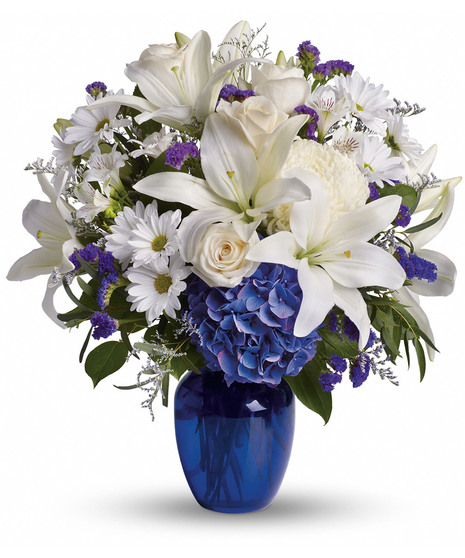 In this arrangement, the serenity of the color blue along with the purity of intention symbolized by white will let the family know you are sending your calm strength to them during these difficult times.