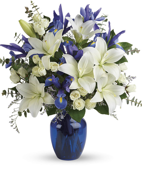 As open and bright as a winter's sky, this exquisite mix of white and blue blossoms would make a stunning birthday gift, or a superb Hanukah present for a favorite friend or family member. An eye-catching selection.
