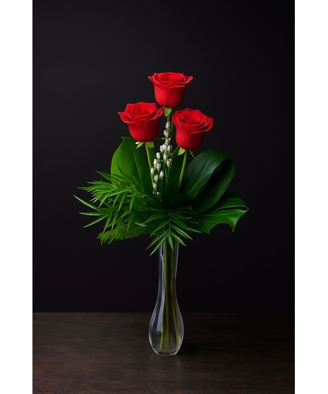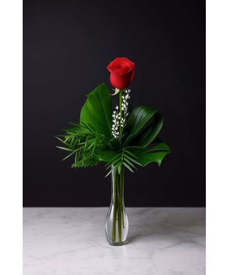Sometimes a rose says it all. Give this sweet representation of pure love with a single, double, or triple rose bud vase with accent blooms and unique foliage in a glass bud vase.