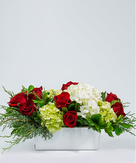 Set your Christmas table with this centerpiece style arrangement designed in a low, long white variety container with a traditional red, green, and white color scheme in blooms like hydrangea and roses, with seasonal Florida greenery like Carolina sapphire and pittosporum, appropriate for a dining room table or kitchen island