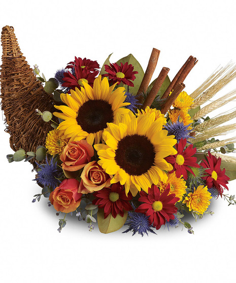 Along with joy, this cornucopia carries an abundance of beautiful fall flowers and foliage. A stunning centerpiece or inviting entryway display, this beauty will be at home anywhere in the house.