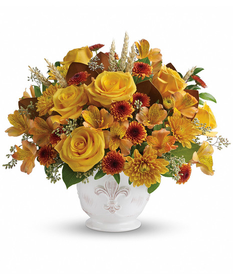 Invigorating as an autumn sunrise, this golden fall bouquet will lighten up any room with its radiant roses arranged in an antiqued French Country pot.