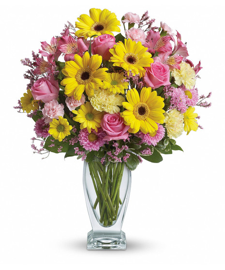 Dazzle someone special with a stylish and bright bouquet! These delightful blossoms in shades of pink and yellow are delivered in a gorgeous glass vase.