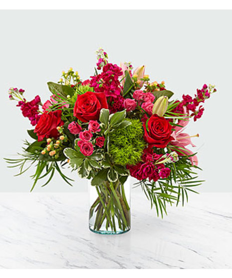 A luxurious celebration of romance and color, Enchanted Rouge combines rich red and pink blooms with lush greenery in a vibrant, modern composition. Velvety red roses and soft pink spray roses are paired with fragrant pink stock, green trick dianthus, and elegant lilies for texture and movement. Designed in a clear cylinder vase, this arrangement is both classic and contemporary — a stunning expression of love, gratitude, or heartfelt joy.