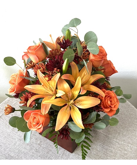 Fall Classic radiates the warmth and richness of the fall season with its vibrant blend of orange lilies, burnt orange roses, and deep burgundy chrysanthemums. The arrangement is artfully complemented with lush eucalyptus and seasonal greens, all presented in a modern wooden cube. Its compact yet full presentation makes it ideal for tables, office décor, or thoughtful seasonal gifting.