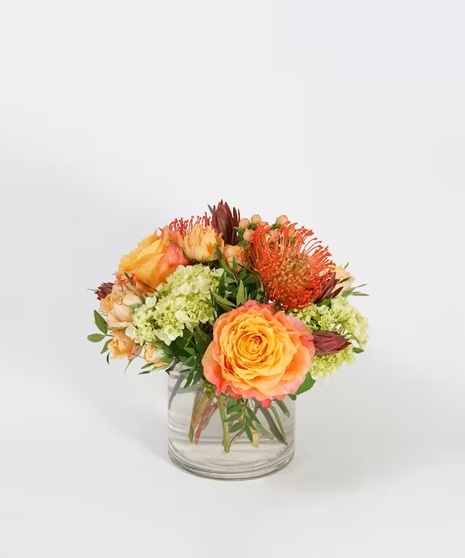 Golden Ember glows with the radiance of fall sunlight and the texture of the harvest season. Vibrant orange roses, lime-green hydrangea, and fiery pincushion protea combine to create a design that is both warm and modern. Nestled in a clear glass cylinder vase, this arrangement strikes the perfect balance between bold color and elegant simplicity — ideal for celebrating life’s golden moments, from birthdays to heartfelt thank-yous.