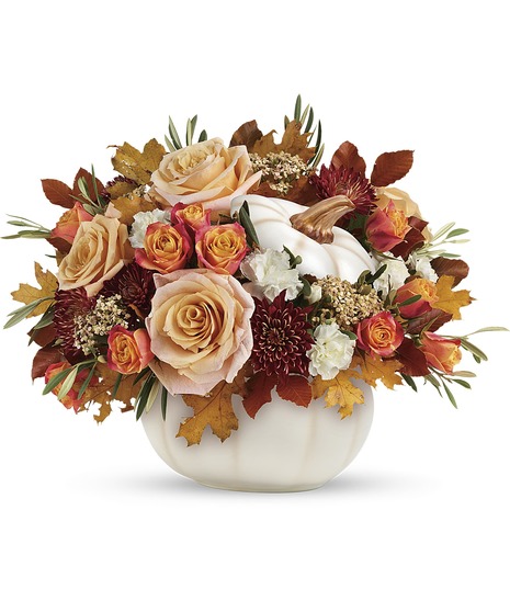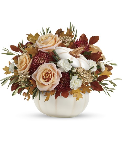 Harvest Charm captures the heart of the season with muted autumn tones and refined natural beauty. A medley of champagne and amber roses mingles with burgundy mums, soft white blooms, and preserved fall leaves, artfully designed in a white ceramic pumpkin container. This sophisticated arrangement blends rustic charm with seasonal warmth — ideal for dining tables, gift-giving, or as a centerpiece that embodies gratitude and abundance.
