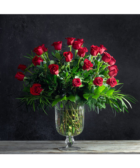 A Classic display of love! Beautiful red roses with lush greenery designed in an extra-large glass vase are what you need to express your deep love when words are not enough!