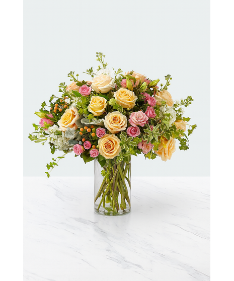 An enchanting medley of blush pinks, soft apricots, and creamy yellows that exudes romance and sophistication. Featuring premium roses, spray roses, alstroemeria, and hypericum berries nestled among lush seasonal greenery, this arrangement is designed in a tall clear glass cylinder for a graceful and abundant presentation. It’s ideal for celebrating life’s most elegant and heartfelt moments.