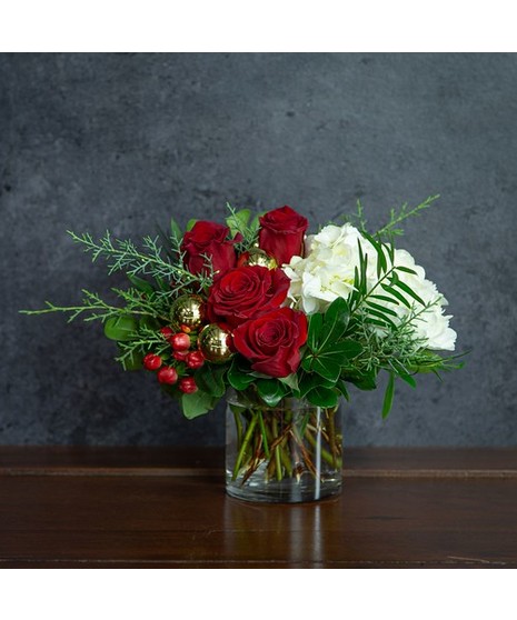 Capture the magic of Christmas with this festive arrangement. Red roses and white hydrangea are accented by red hypericum and gleaming gold ornaments, and situated among beautiful greenery. Appropriately sized for an end table or coffee table, this piece will be the perfect addition to your home for the holidays.