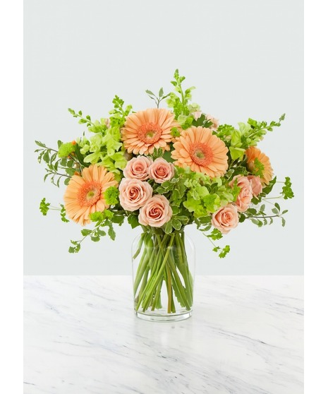 Soft, serene, and effortlessly elegant, Peach Retreat is a soothing composition of peach gerbera daisies and roses surrounded by lush greenery and fresh lime-toned textures. The airy design evokes tranquility and grace, making it an ideal gift for expressing appreciation, sympathy, or simple affection. With its modern garden style and gentle palette, this arrangement brightens any space with understated beauty and refinement.