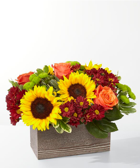 The Rustic Radiance arrangement celebrates the warmth of autumn with a charming blend of sunflowers, orange roses, and rich burgundy mums, accented by vibrant green button poms. Designed in a weathered wooden box, this arrangement captures the beauty of the countryside — cheerful, natural, and effortlessly elegant. It’s perfect for brightening homes, dinner tables, or sending heartfelt cheer during the fall season.