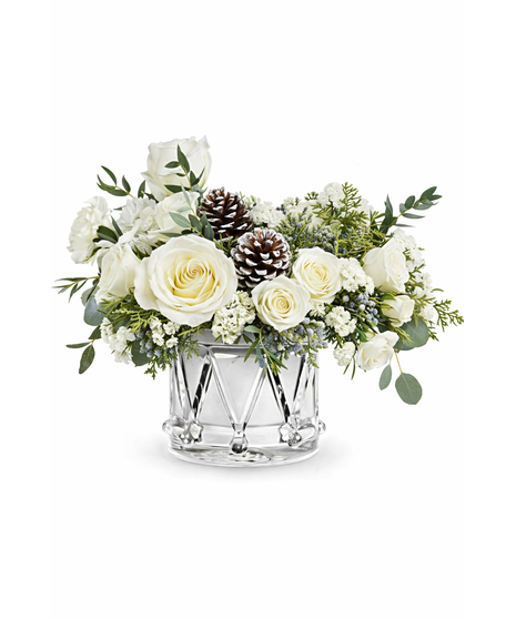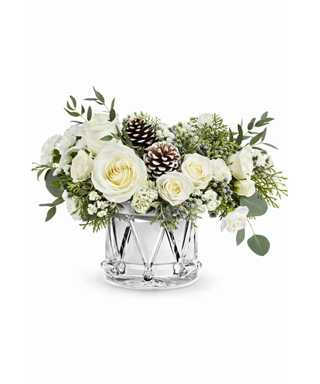 Sparkling Wishes Bouquet is a winter wonderland of white blooms, fresh greenery, and frosted pinecones. Arranged in Teleflora's keepsake Crystal Drum Vase, it's a stunning gift for the holidays or New Year.