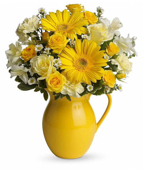 This bouquet is just bright for any occasion! A bright and sunny medley of flowers is hand-delivered in a brilliant ceramic pitcher that can be joyfully used over and over again.