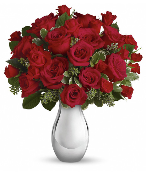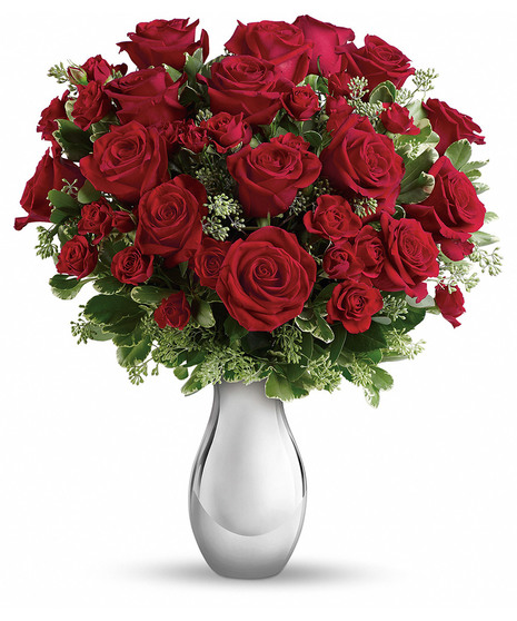 Turn up the heat on a new romance - or a lifelong love affair - with this classic composition. It features one dozen of our finest red roses arranged in our stunning Silver Reflections vase.