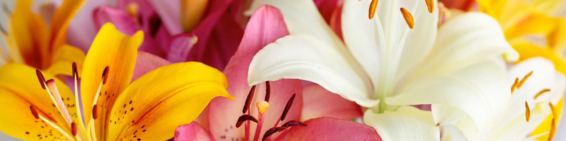 Display your lilies in a bright yet cool location, away from direct sunlight, windowsills, and drafts from air vents. Since these flowers can be toxic to pets, finding the perfect spot on a tall shelf or out of reach is a great idea. Tending to your fresh-cut lilies daily will also ensure they thrive for as long as possible. Be sure to give their stems a fresh trim as you change their water.