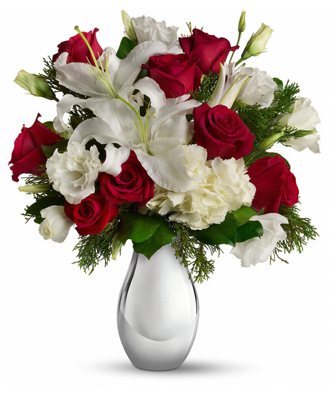 This fashionably festive holiday bouquet features red roses and snowy white hydrangea, lilies and lisianthus in a sparkling silver reflections vase. The perfect gift for anyone who'd like tradition spritzed up with a little Christmas charisma.