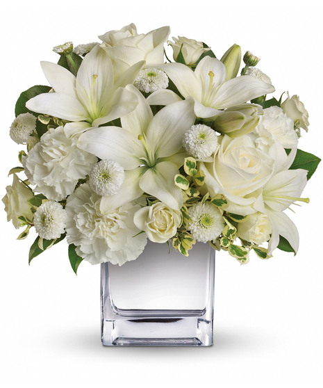 Surprise a faraway friend with this elegant array of Christmas flowers. White roses, lilies and other favorites are displayed in a chic mirrored silver cube. Simple and affordable, it is a lovely gift that will brighten spirits without breaking your bank.